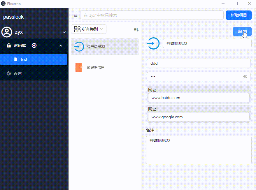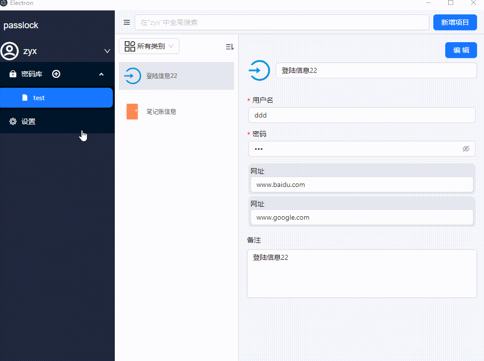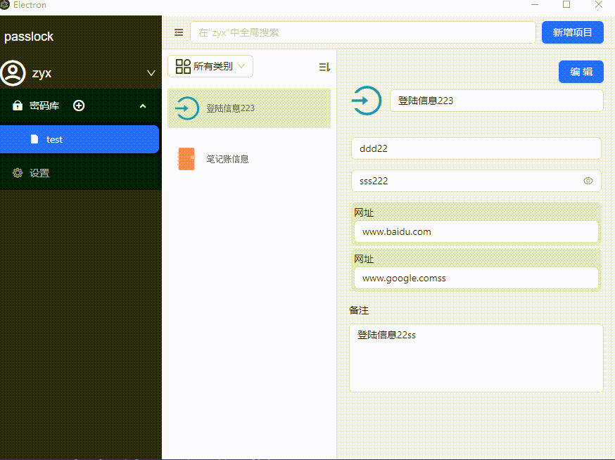 - 多种密码信息支持: 登陆信息、银行卡信息、笔记信息的保存