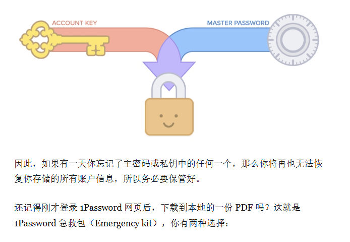 所谓 2SKD(two-secret key derivation)机制,指的是1Password 同时使用你自己设定的主密码(Master password)和私钥(Secret key)来加密你的信息,以及在与服务器通信的过程中验证你的身份。