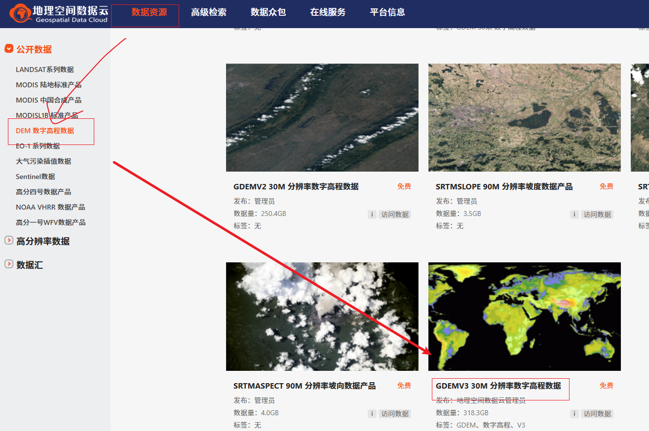 以https://www.gscloud.cn/为例:目前免费的只有30m的精度。