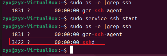 有sshd说明ssh服务已经启动,如果没有启动,请输入sudo service ssh start,回车后ssh服务就会在Ubuntu 系统下启动了