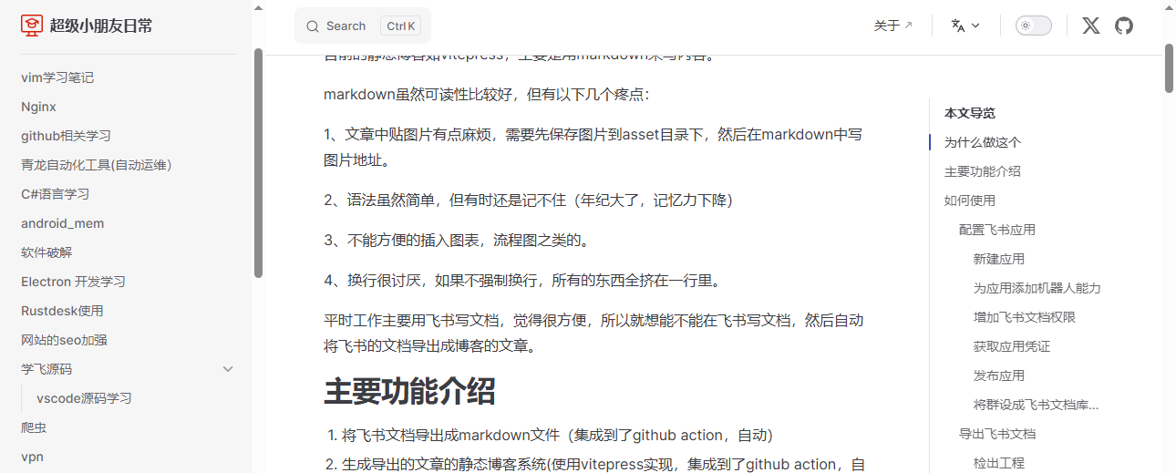 - 生成导出的文章的静态博客系统(使用vitepress实现,集成到了github action,自动)